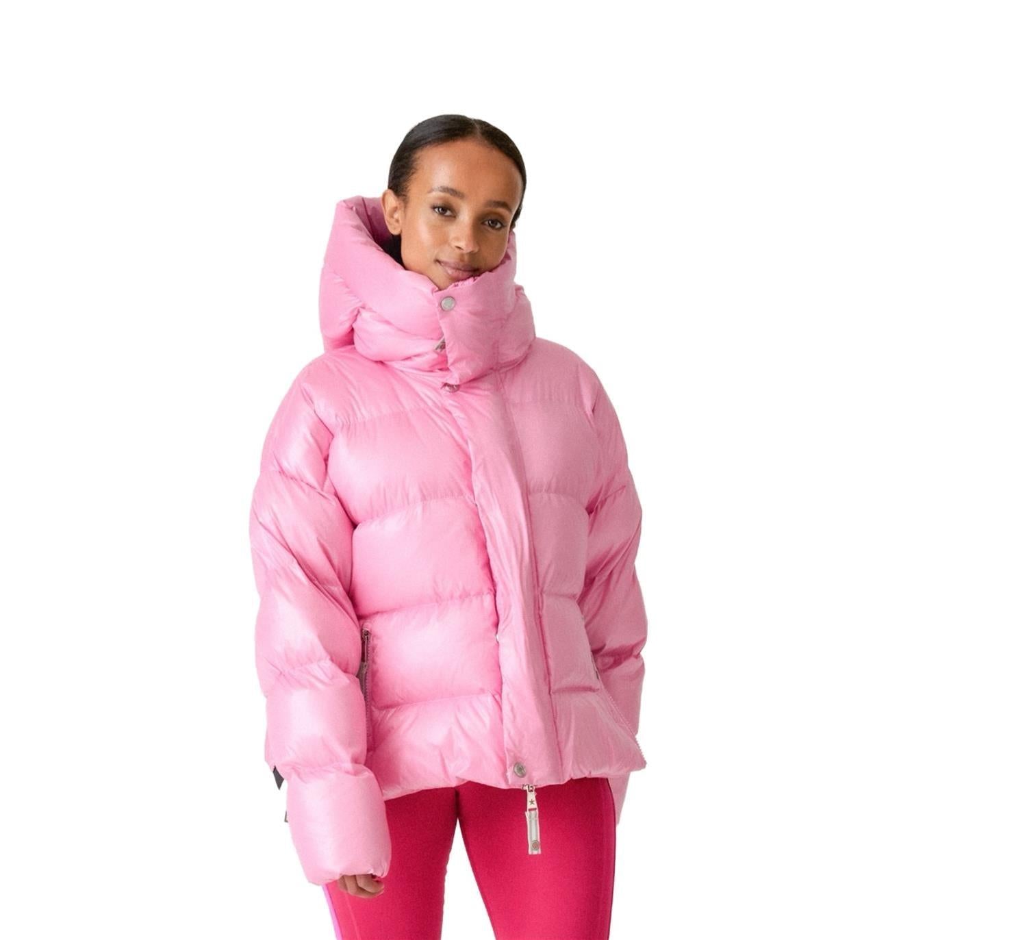 "Ginny Short down jacket" fra C.A.Y.A. En kort dunjakke i rosa med flere kule og unike detaljer. Jakken har både glidelås og knapper i front, en komfortabel hette, splitt med glidelås i sidene, stropper på innsiden samt sidelommer med glidelås.