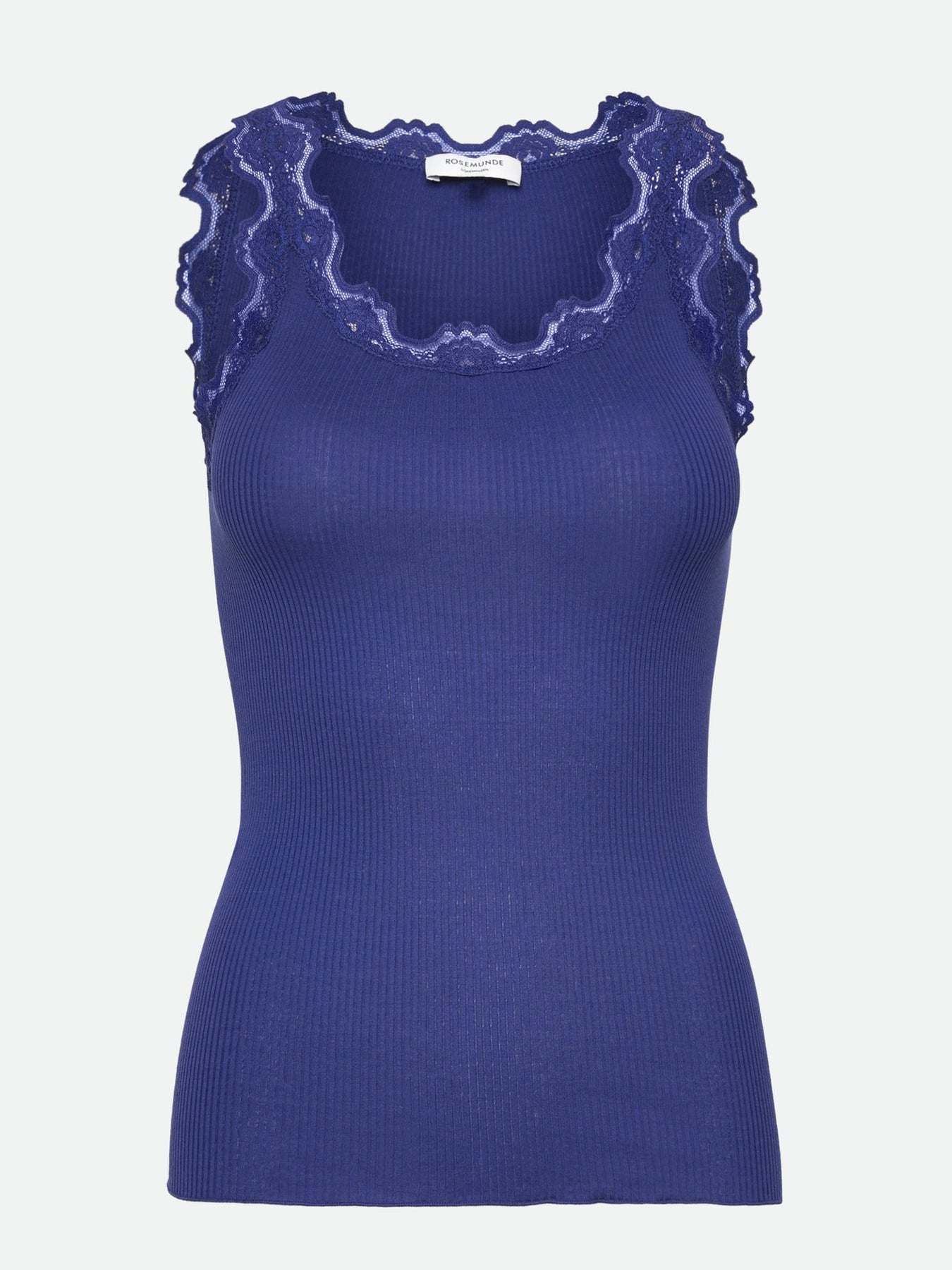 "Silk top w/ lace" fra Rosemunde. En lekker topp i blå med nydelige blondedetaljer.
