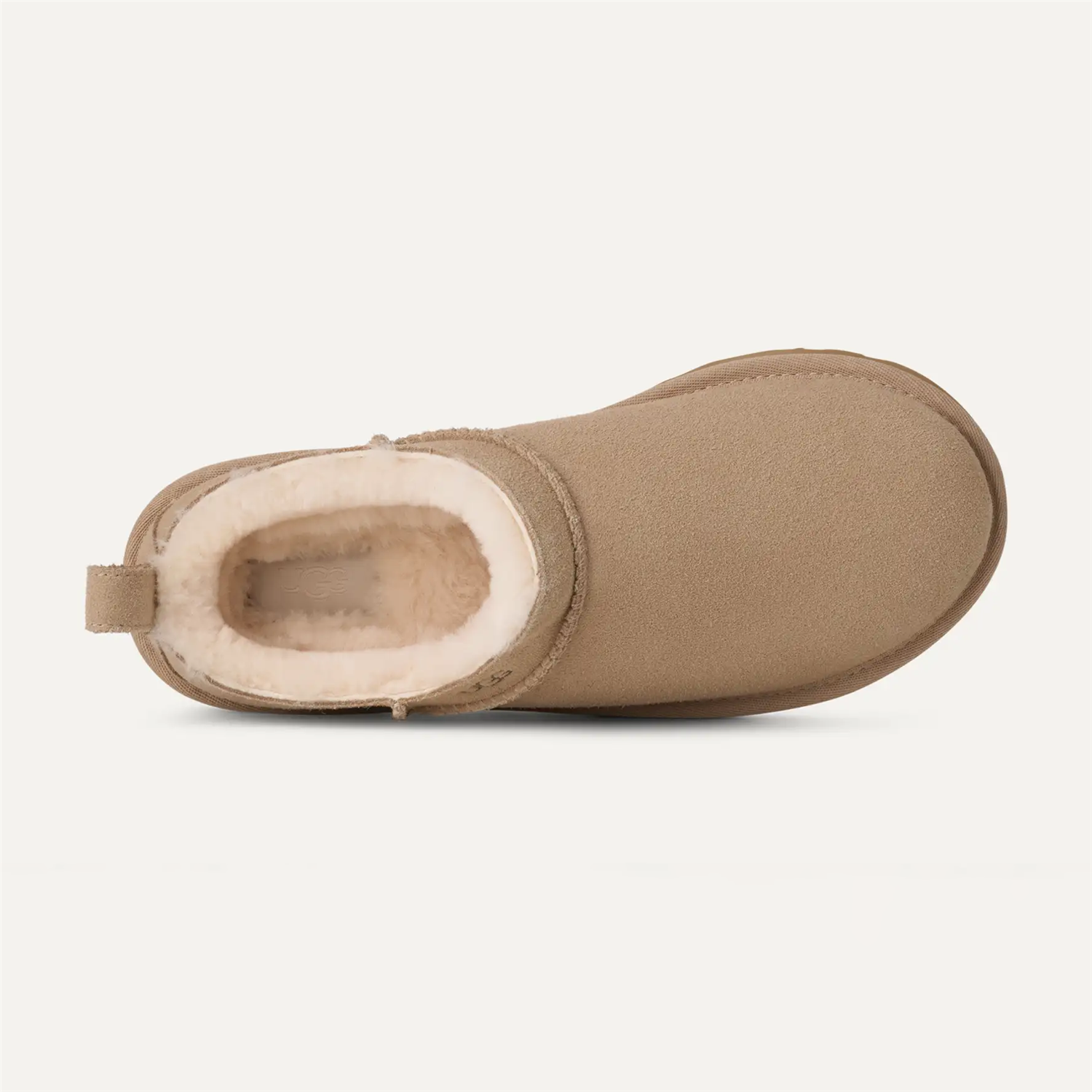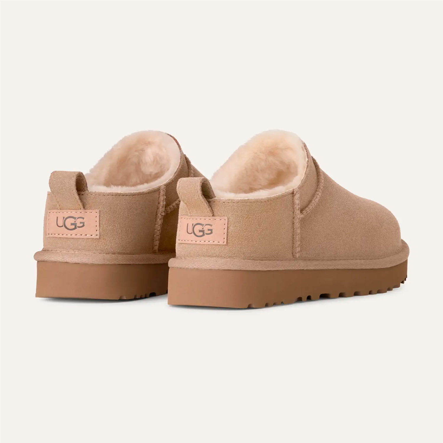 Classic Micro i beige gjenskaper UGGs populære Classic Boot med en lavere profil uten å gå på kompromiss med komforten. Overdelen i ekte semsket skinn er fôret med supermykt saueskinn som naturlig regulerer temperaturen, slik at du kan bruke skoene med eller uten sokker. Den lette sålen i sukkerrør-EVA gir stabil støtte og en myk, lett “slipper-følelse” hver gang du er ute på farten.