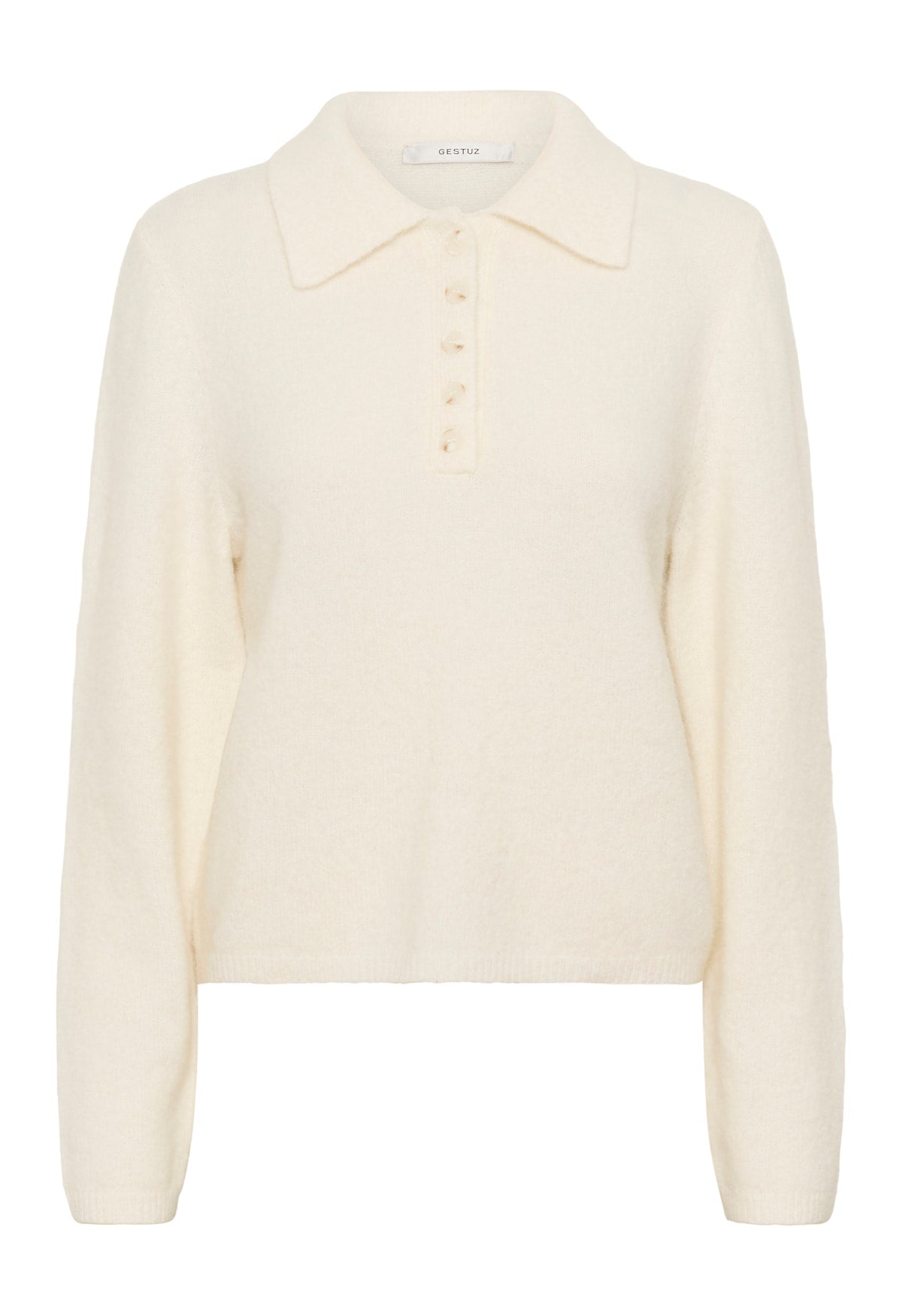 "GZalpha Polo Pullover" fra Gestuz. En nydelig og myk, langermet strikkegenser med krage. Den kan styles både til hverdag og finere anledninger.