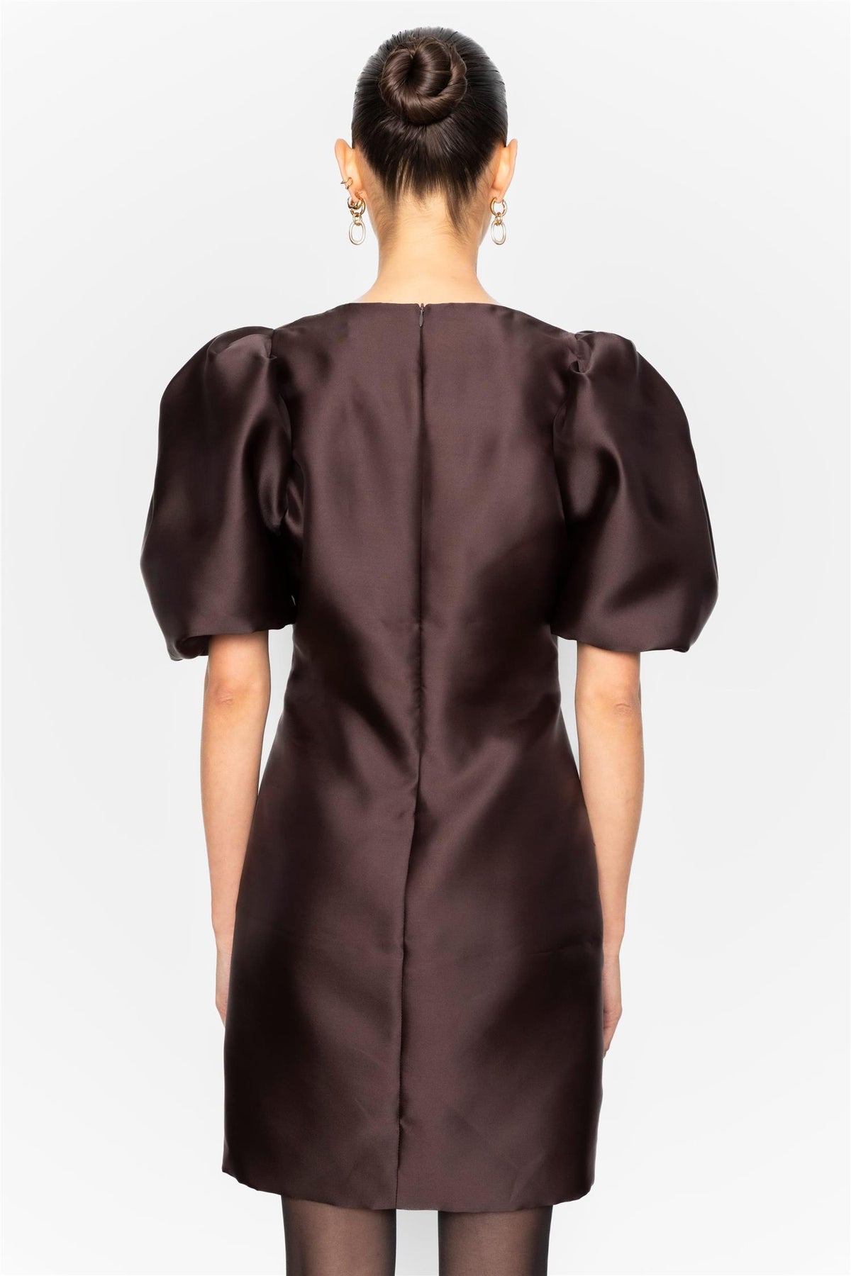 "Rosie Dress" fra Camilla Pihl er en figurnær kjole i brun med v-utringning og voluminøse ermer som stopper like over albuen.