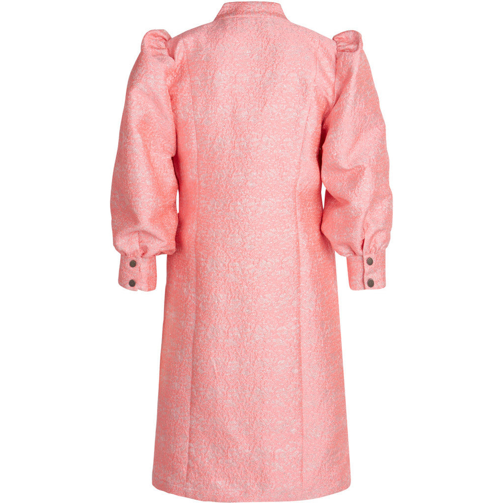 "Sweetpea Anne Dress" fra Bruuns Bazaar. En nydelig rosa kjole som har skimrende metalliske fiber. Kjolen har skjulte skuldersømmer, gjemte knapper ned langs fronten og store voluminøse ermer.