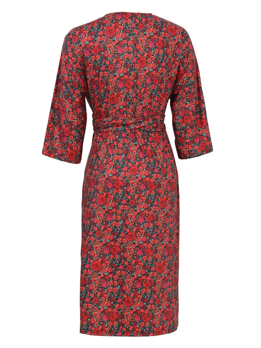 "Billie dress" fra Rosemunde med rødt og grønt blomsterprint. Ton den ned med enkle, sorte sko og tilbehør, eller make it pop med flere spreke farger.