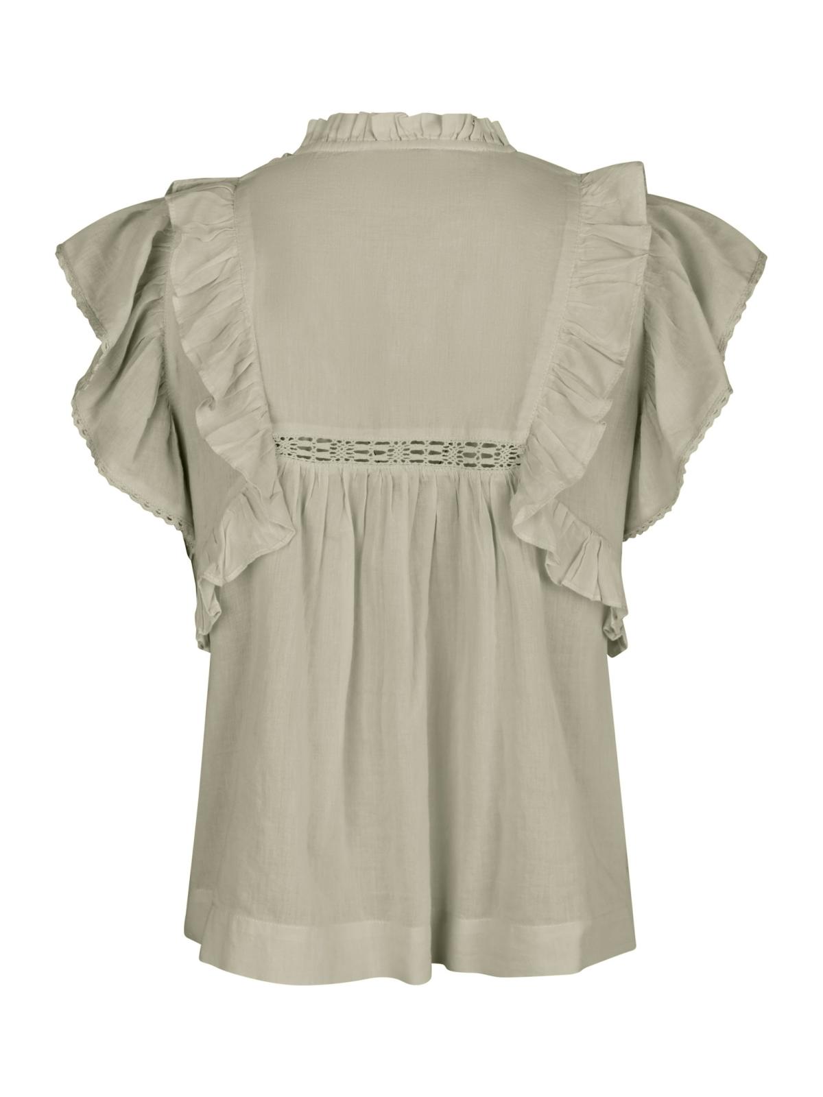 "Jayla S Voile Top" fra Neo Noir. En feminin, ermeløs topp med delikate detaljer som volanger og dekorative bånd. Den har en løs og ledig passform som gir god komfort, samtidig som snittet sørger for et flatterende og elegant uttrykk. Perfekt til både hverdag og mer pyntede anledninger.
