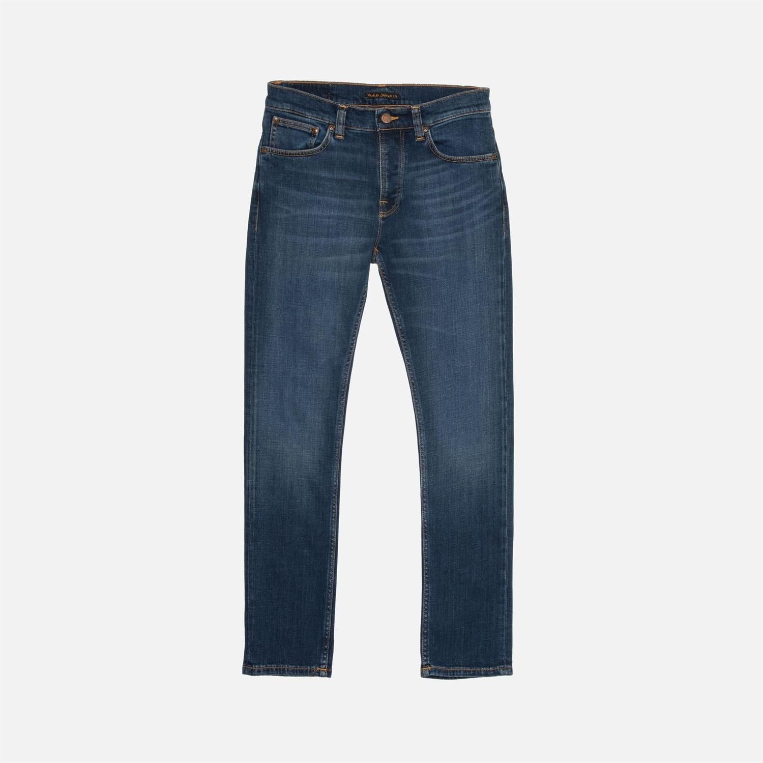 "Grim Tim" fra Nudie Jeans. En slim fit stretchjeans med rette bein. Jeansen har oransje tråder på alle sømmer.