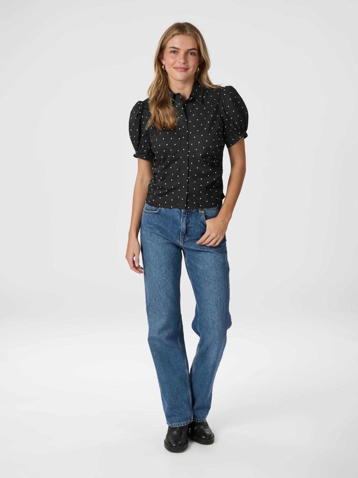 "Frannie Dot Shirt" fra Neo Noir. En søt bluse med polkadot mønster. Den har en dekorativ knapp i halsen og korte puffermer.