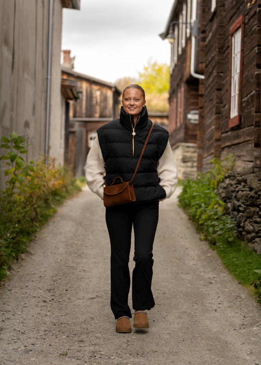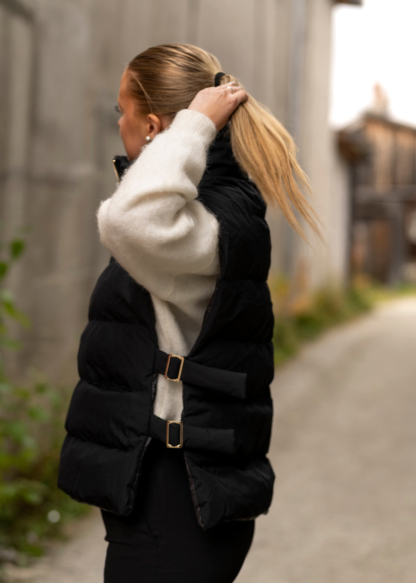 "THOQ Vest Lang" fra THOQ. En unik dunvest med høy krage som holder deg varm. Den er laget med 90/10 dun og har praktiske spenner i sidene så du kan justere passformen. Perfekt over en genser på kjølige dager!
