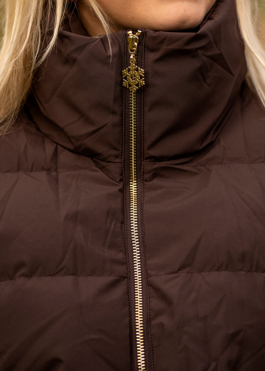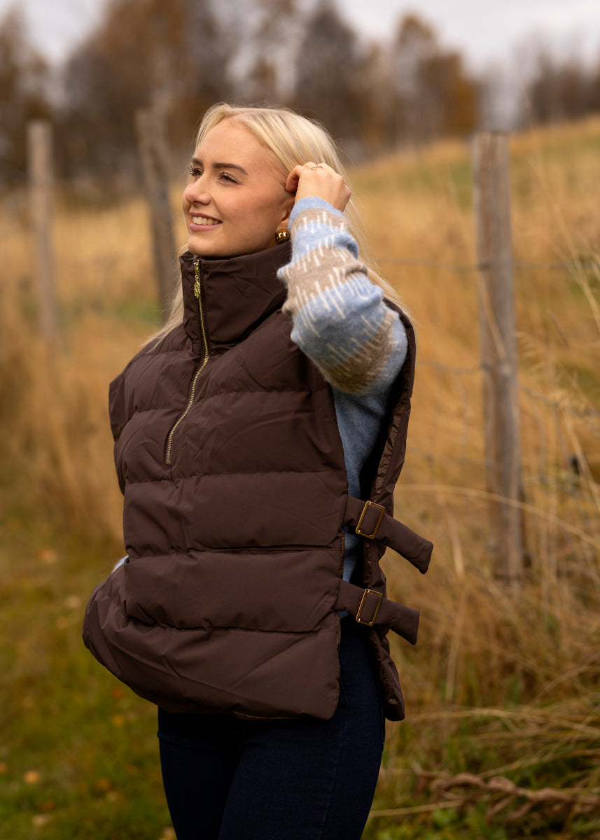 "THOQ Vest Lang" fra THOQ. En unik dunvest med høy krage som holder deg varm. Den er laget med 90/10 dun og har praktiske spenner i sidene så du kan justere passformen. Perfekt over en genser på kjølige dager!