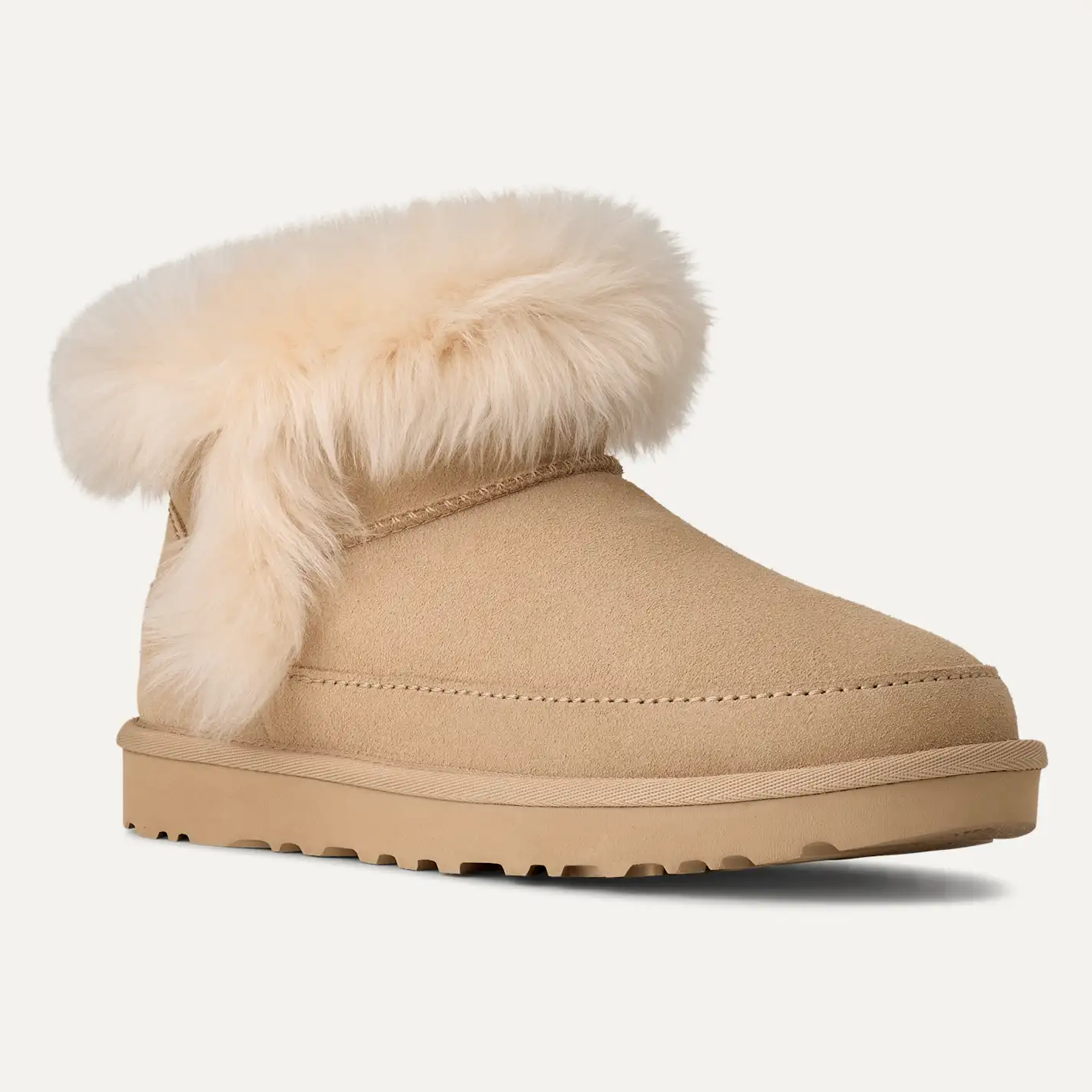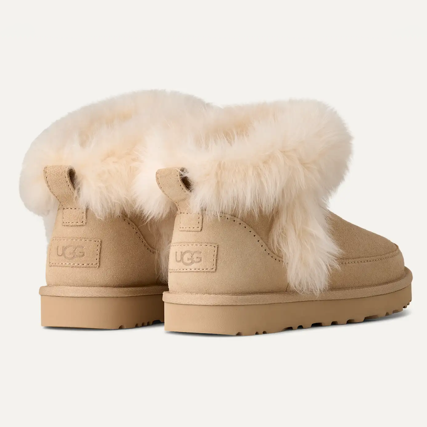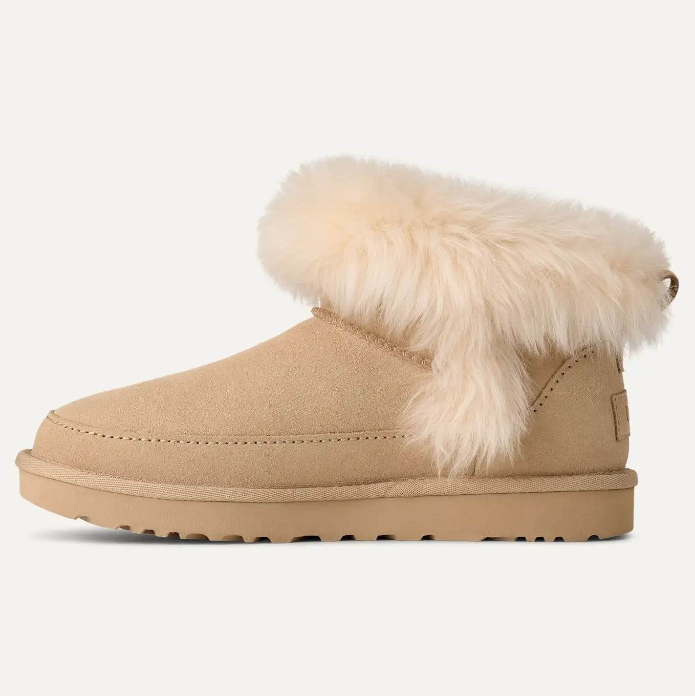 "W Classic Ultra Mini Chalet" fra UGG. En moderne og luksuriøs versjon av den ikoniske Classic Ultra Mini – designet for maksimal komfort og varme gjennom sesongen. Skoen kombinerer mykt semsket skinn med fluffy saueskinnsdetaljer og et varmt, isolerende fôr, som gir en eksklusiv og koselig følelse både ute og inne. Den lave silhuetten gjør den enkel å ta av og på, og gir et stilrent uttrykk som passer til enhver vintergarderobe.