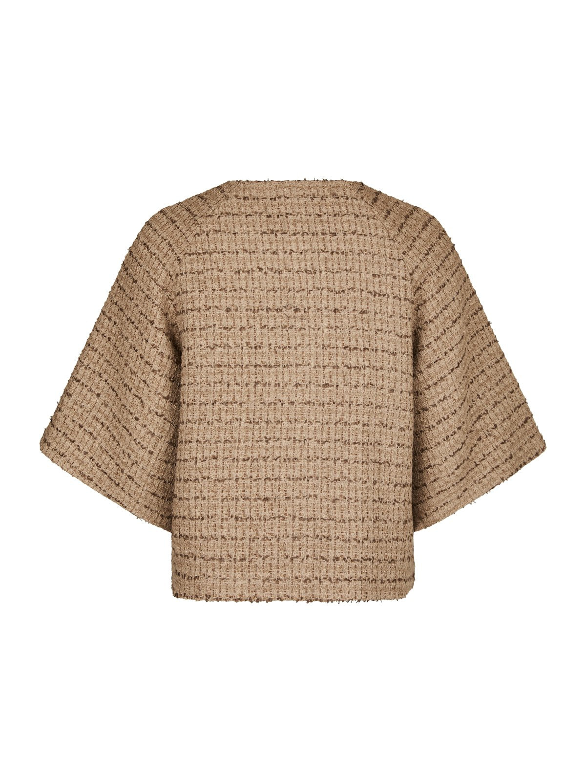 "Rosella Boucle Mini Jacket" fra Neo Noir. En nydelig kort beige jakke med 3/4, vide ermer. Den har en lett struktur i stoffet og fine gullknapper som detalj