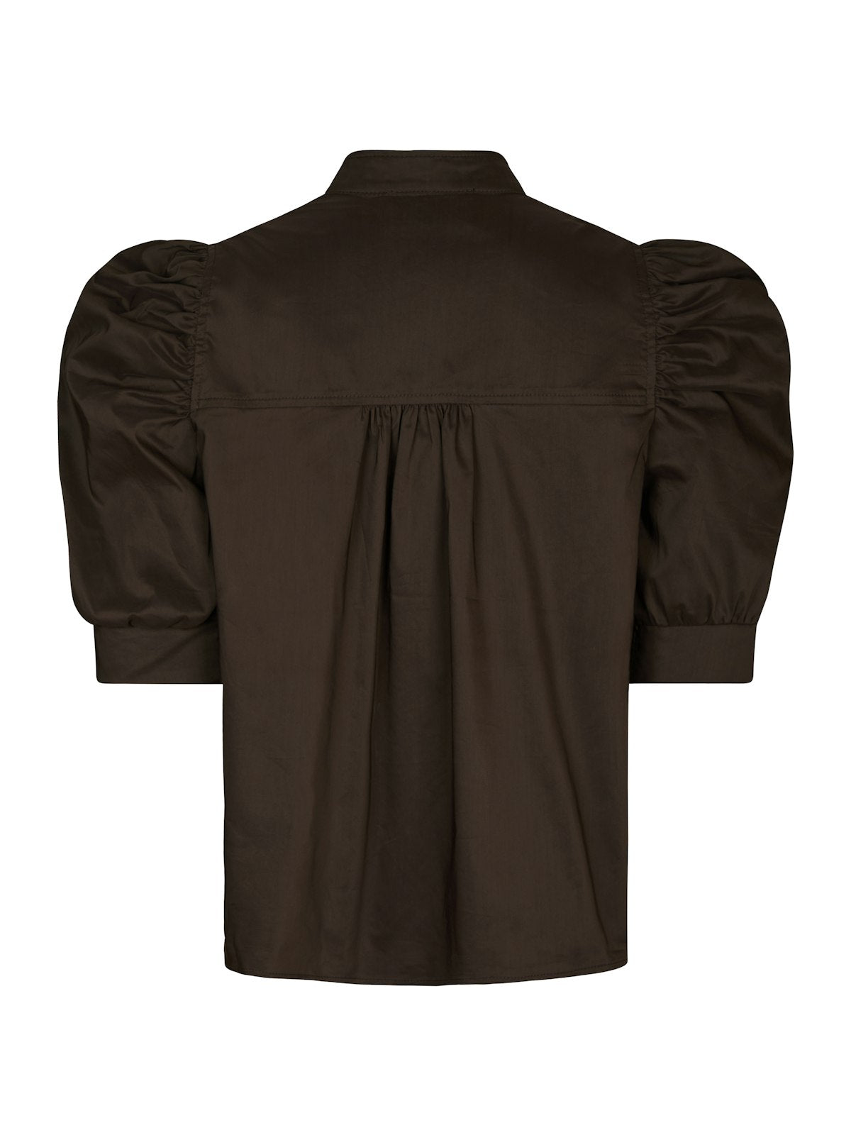 "Roella Heavy Sateen Blouse" fra Neo Noir. En feminin bluse i trendy brun, med v-hals og draperte detaljer i ermer.