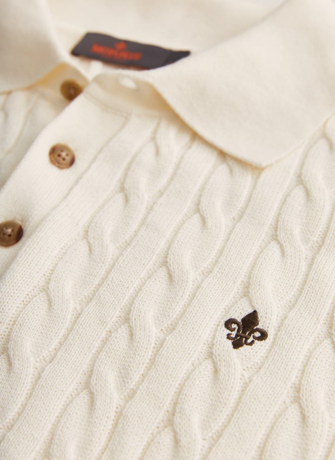 "Lancaster Cable Polo" fra Morris Stockholm. En klassisk piqué-inspirert polo med kabelstrikket struktur som gir et elegant og teksturert uttrykk. Den ribbestrikkede kragen og passformen gjør den komfortabel å bruke gjennom hele sesongen.