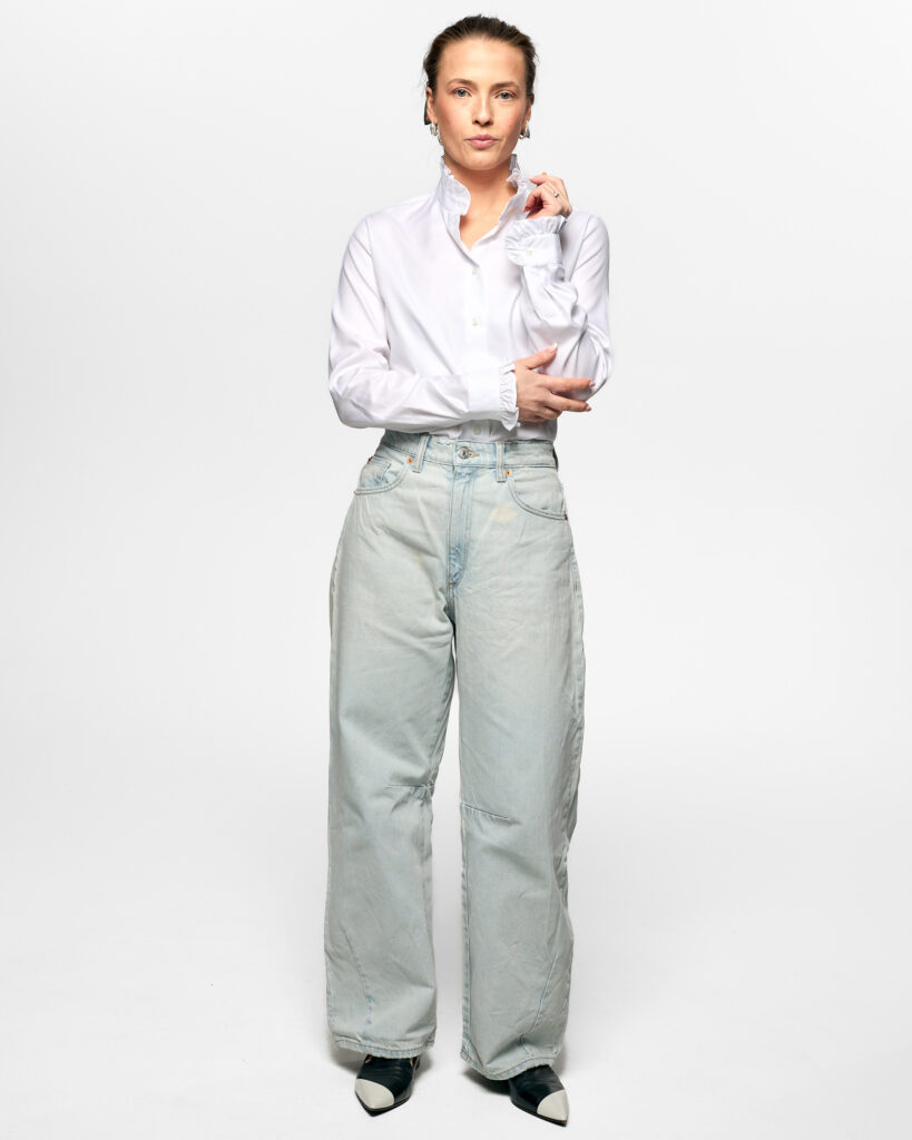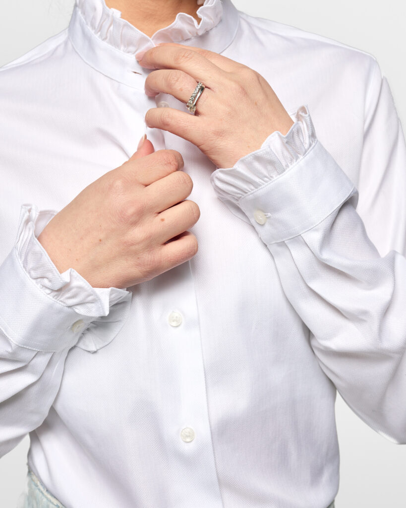 "Juliette Herringbone" fra Rebeloup. En nydelig skjorte med volangdetaljer som gir et stilig preg til skjorten.
