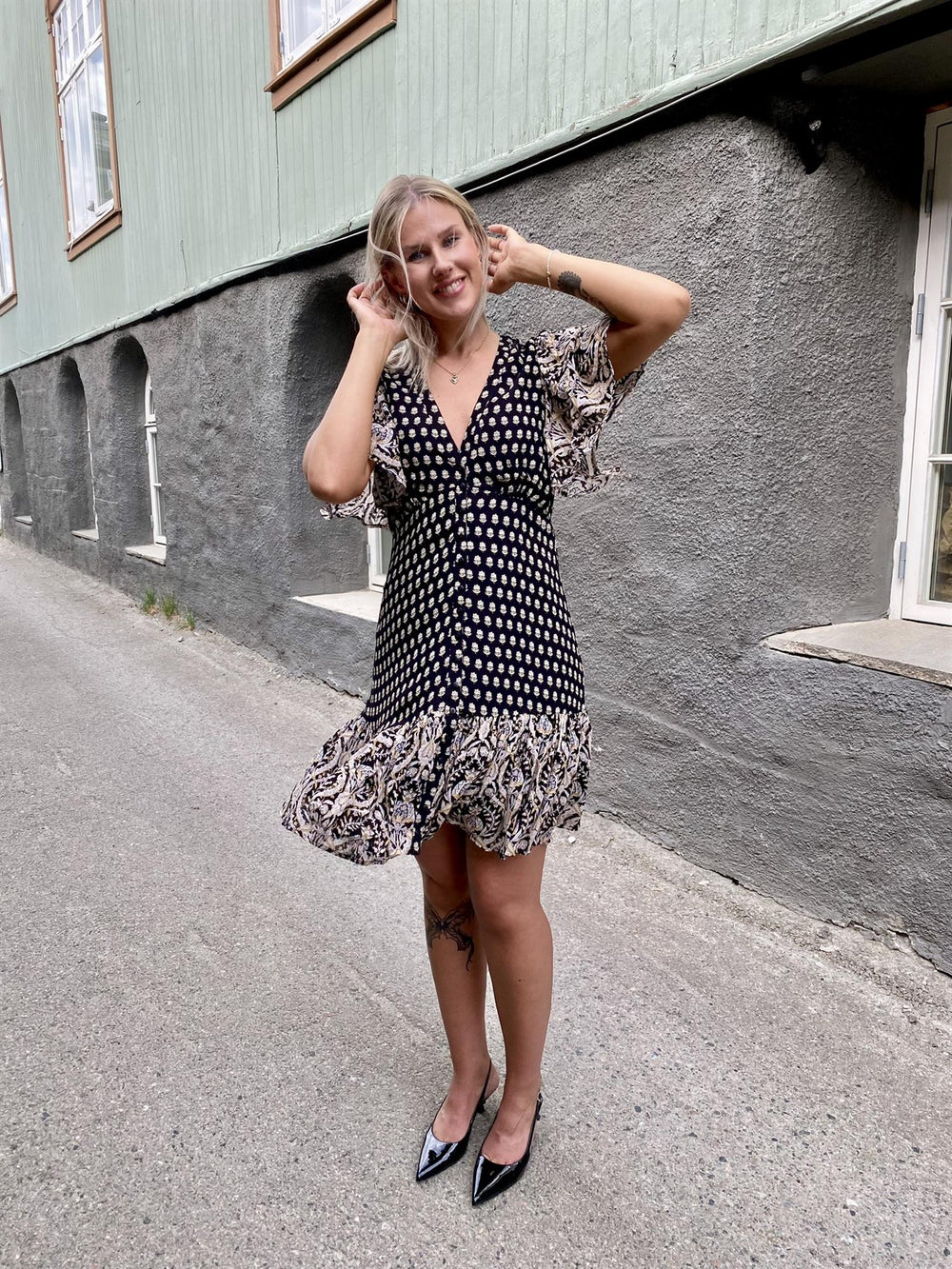 "Georgette Flounce Dress" fra byTiMo. En nydelig kjole med flott og lekent mønster.