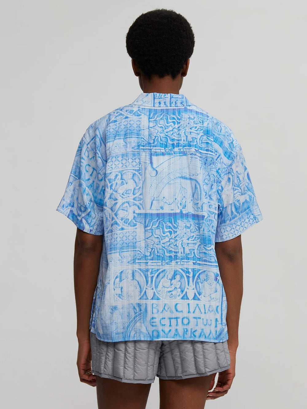 "Edgar shirt" fra Holzweiler med print i blå og hvit. Skjorta har fritidskrage og stolpe med blå knapper, er avslappet i passformen og har normal lengde. Lett og myk kvalitet i 55% rayon og 45% polyester.