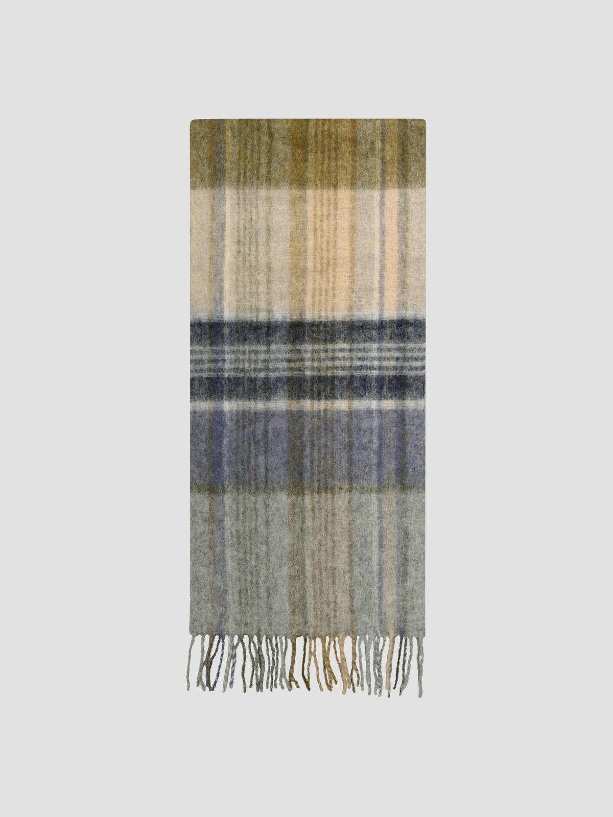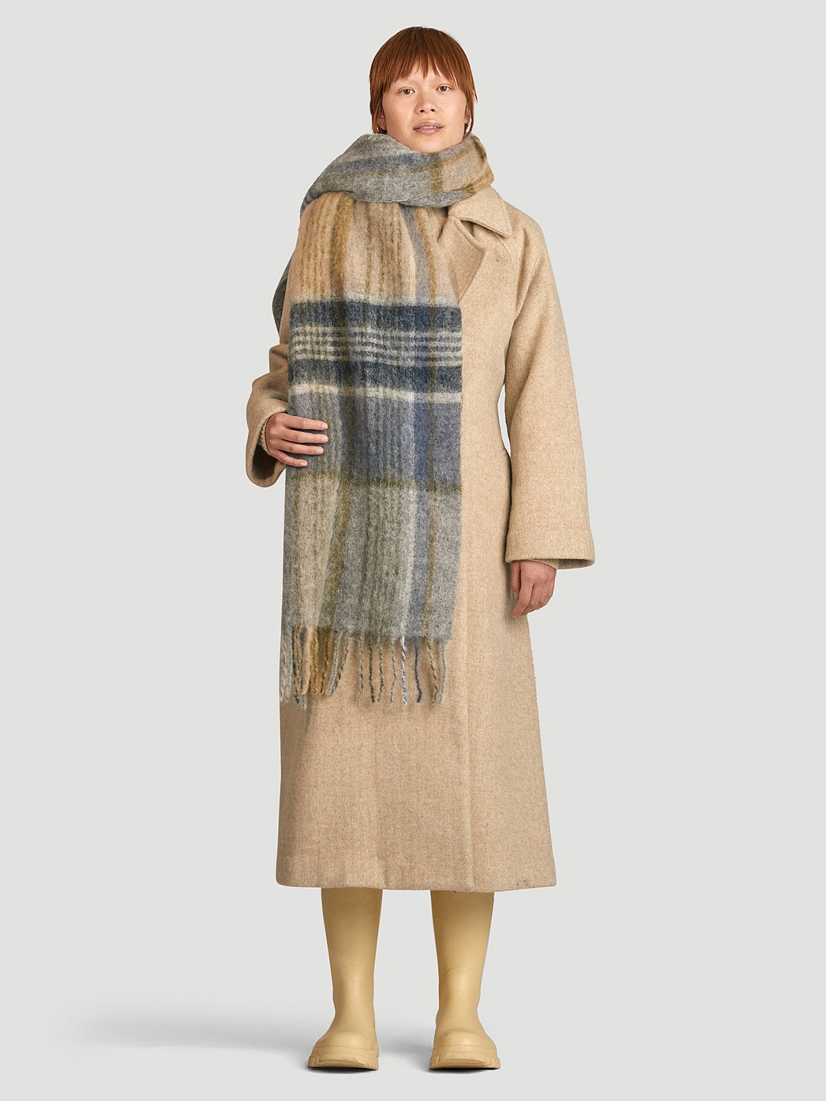 Rutete skjerf fra Holzweiler, i blå- beige- og grønne toner. Det er varmt og mykt, og derfor perfekt for kaldt høst- og vintervær.