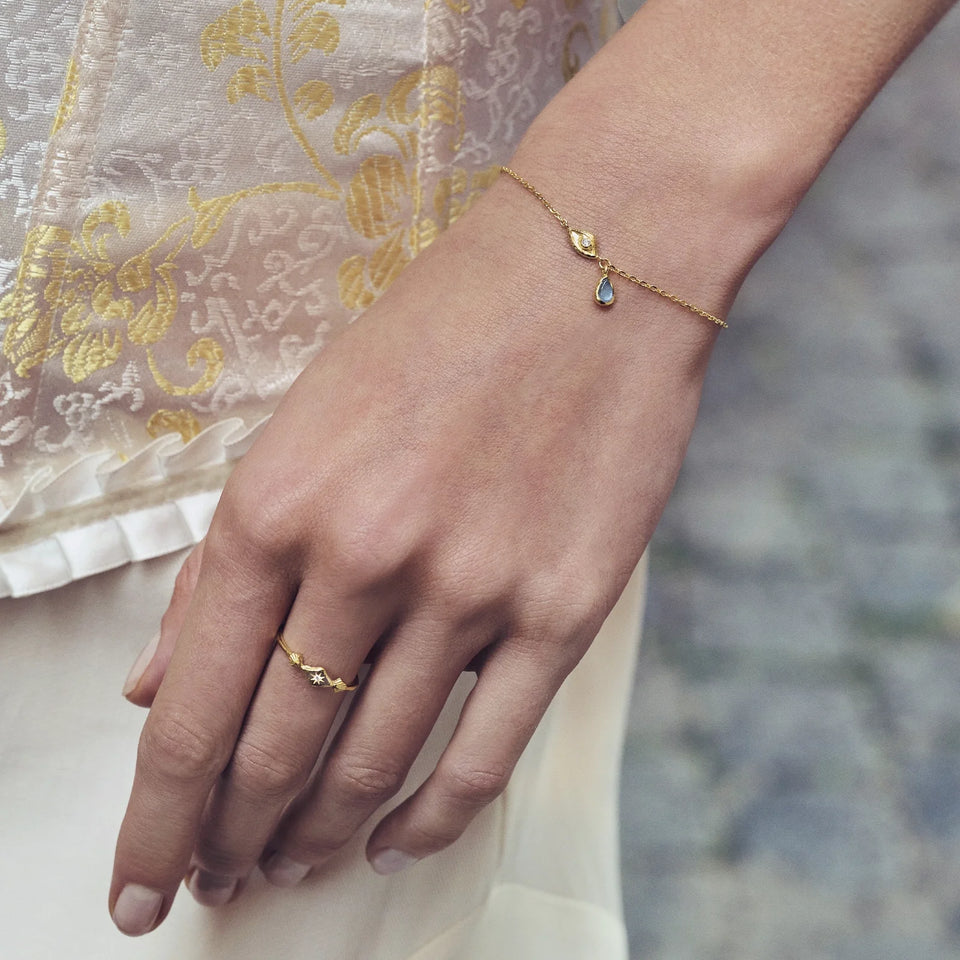 "Cosette Bracelet" fra Maanesten. Et armbånd i gull med detaljer i blå.