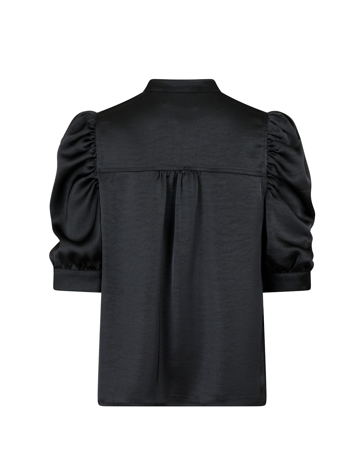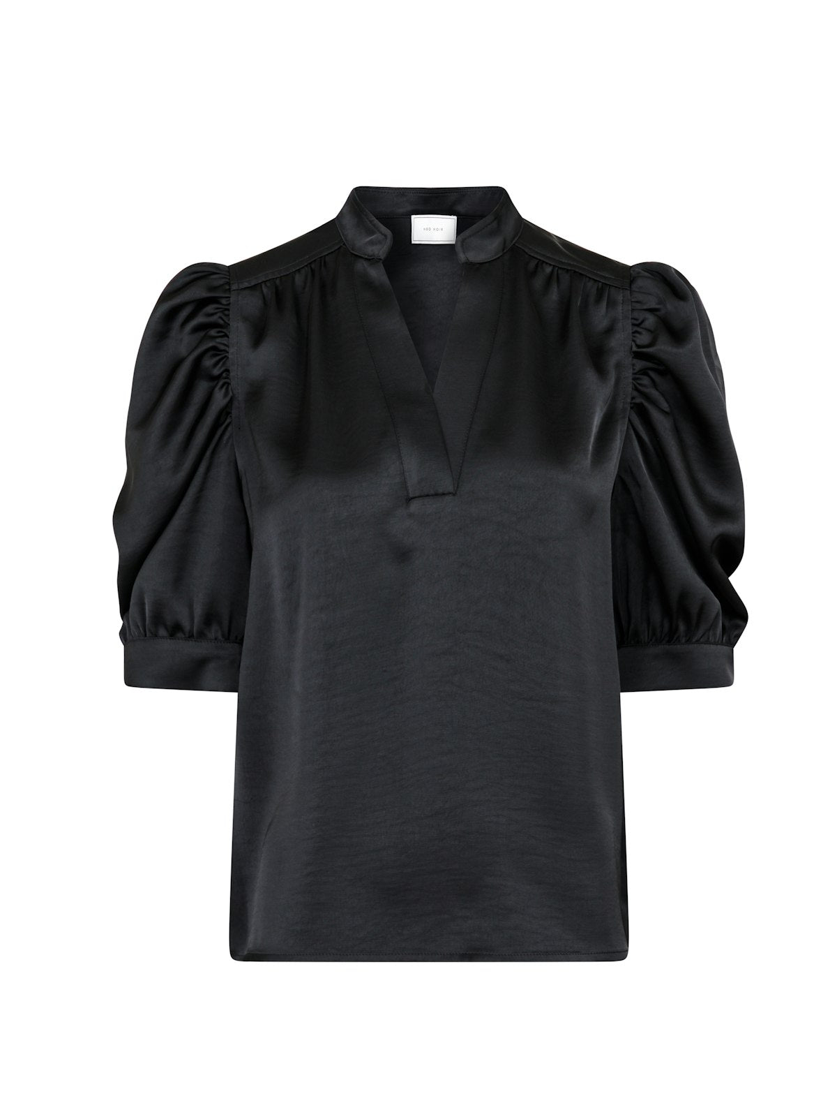 "Roella Heavy Sateen Blouse" fra Neo Noir. En feminin bluse i sort med v-hals og draperte detaljer i ermer.
